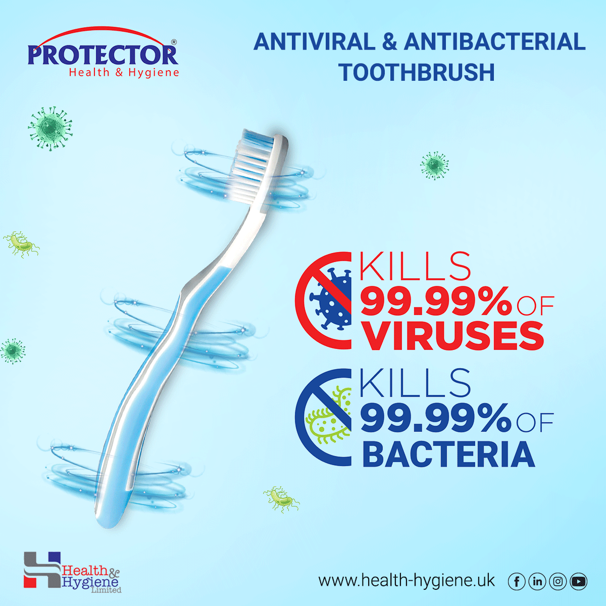 Protector® Toothbrushes have been extensively tested by international third-party labs for Antiviral and Antibacterial performance. Protector® Toothbrush is 99.9% effective against Coronavirus strain MHV-3 genus Beta coronavirus tested in accordance with ISO 21702. Its antibacterial efficacy is 99.99% tested in accordance with ASTM E 2149 and ISO 22196. Protector® Toothbrushes comply with US 21 CFR FDA and EU regulation No. 10/2011. Viruses, bacteria, and microbes are killed upon contact with the Protector® Toothbrush surface, hence providing safe, healthy & smiley brushing.